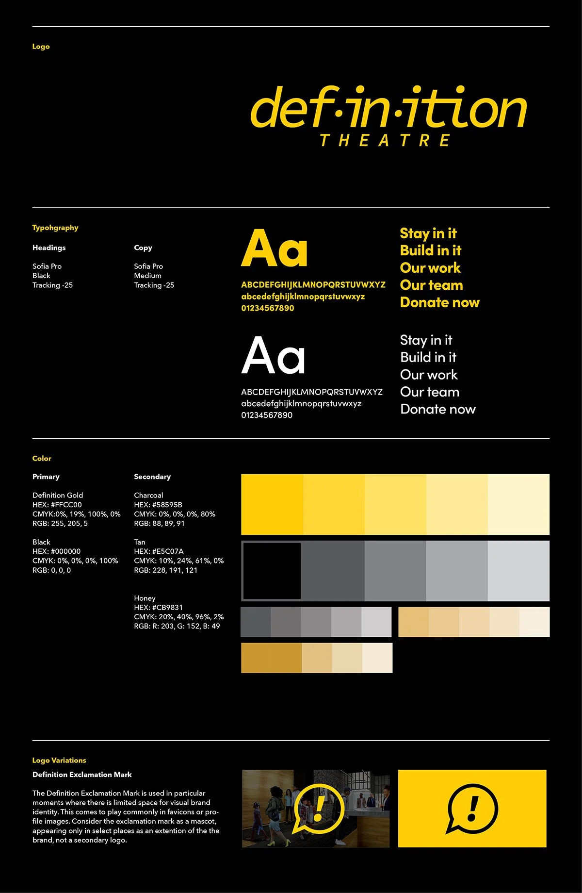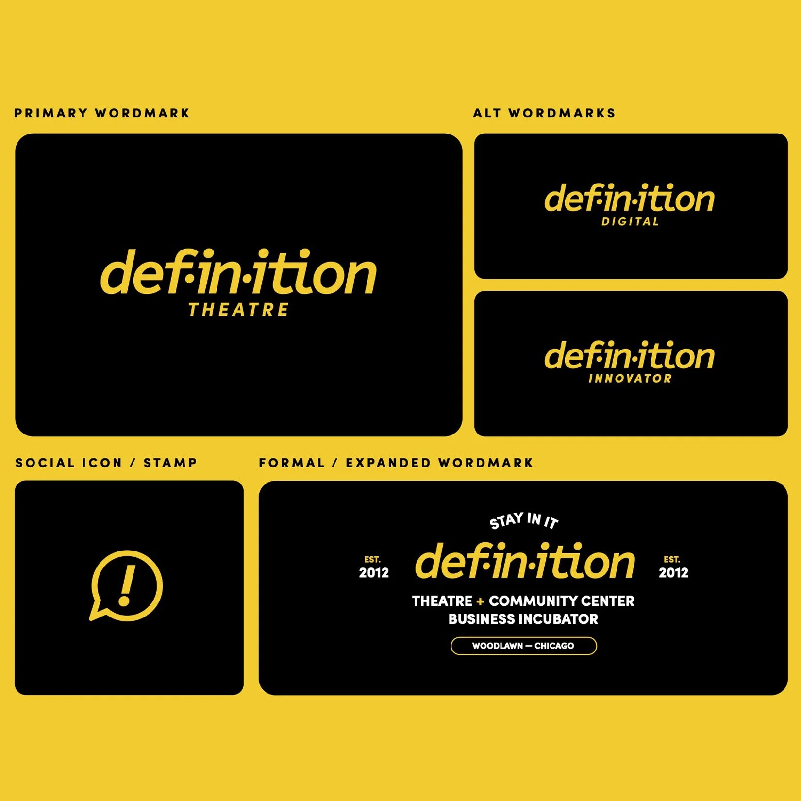 When onboarded in early 2019, I began to develop new foundations for the brand that would allow us to expand into the more interdisclipinary organization we have evolved into today. While maintaining key elements of the original dictionary “definition” inspiration, we shifted to a more contemporary typeface that could be flexible into our three key divisions: theatre, digital/film, and a business incubator.