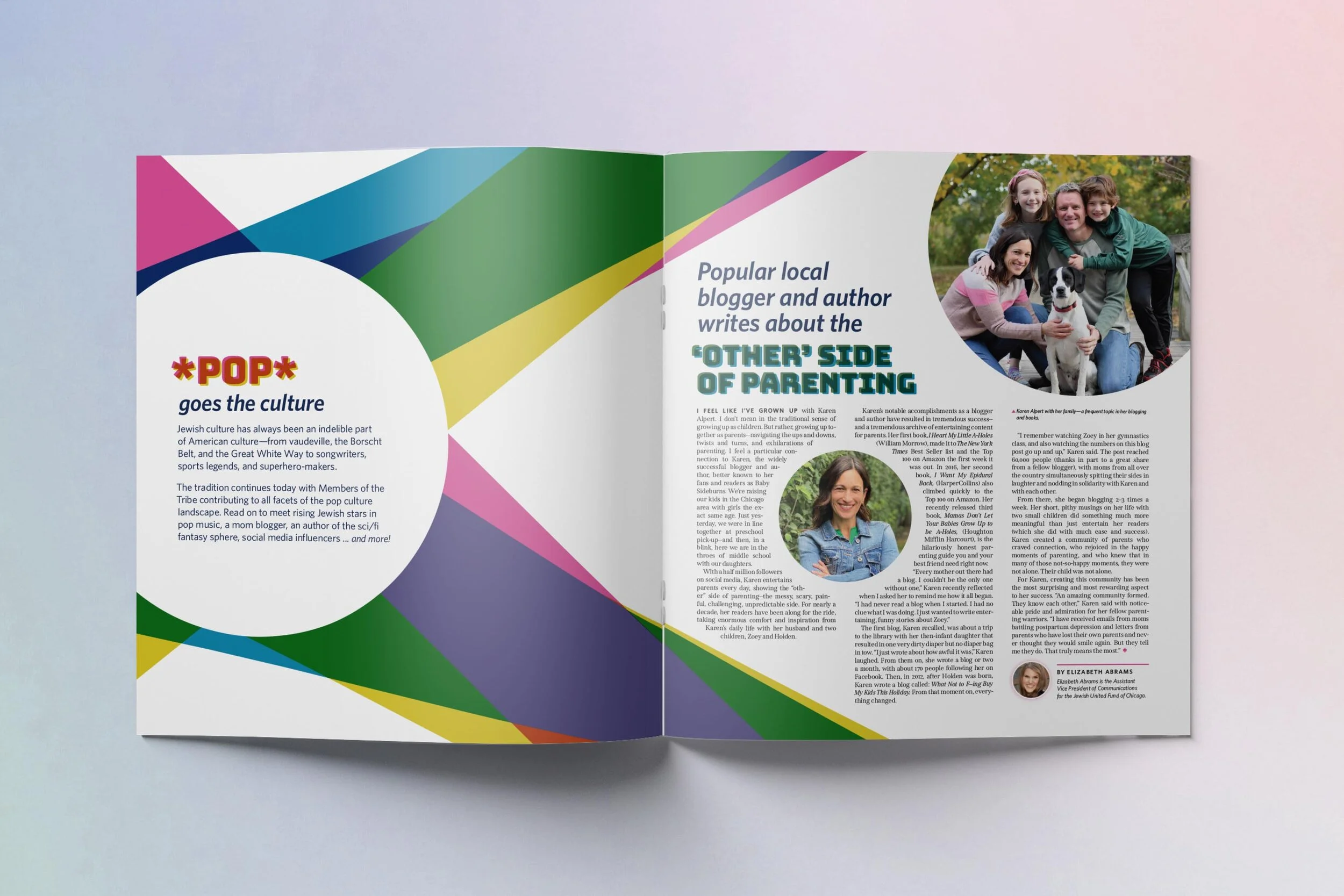 Jewish Chicago is the largest circulation of any Jewish publication in Chicago—and the Midwest, with over 200,000 readers. Dedicated to Entertainment, the October issue features two rising Jewish pop-stars and their experiences navigating the music industry. As the second official issue under the magazine name change, this cover and spread seek to make a bold statement for our potential advertisers, showing the wide range of Jewish artists across the nation. A stylistic photo treatment combined with striking color shapes creates a delightful journey for the reader.